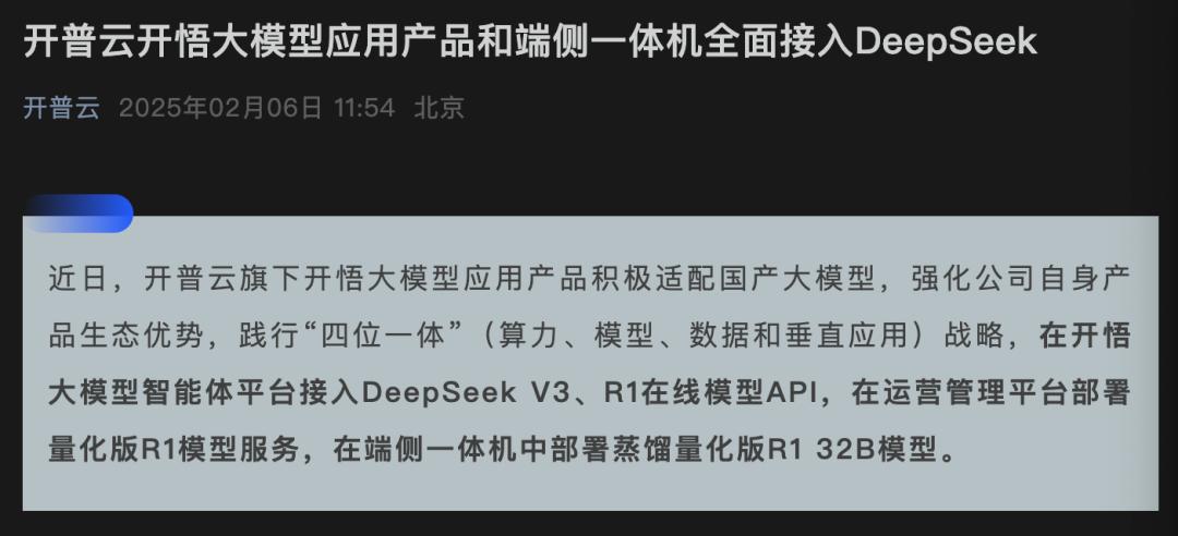 開普云則宣布在開悟大模型智能體平臺(tái)接入DeepSeek V3、R1在線模型API,在運(yùn)營(yíng)管理平臺(tái)部署量化版R1模型服務(wù),在端側(cè)一體機(jī)中部署蒸餾量化版R1 32B模型。