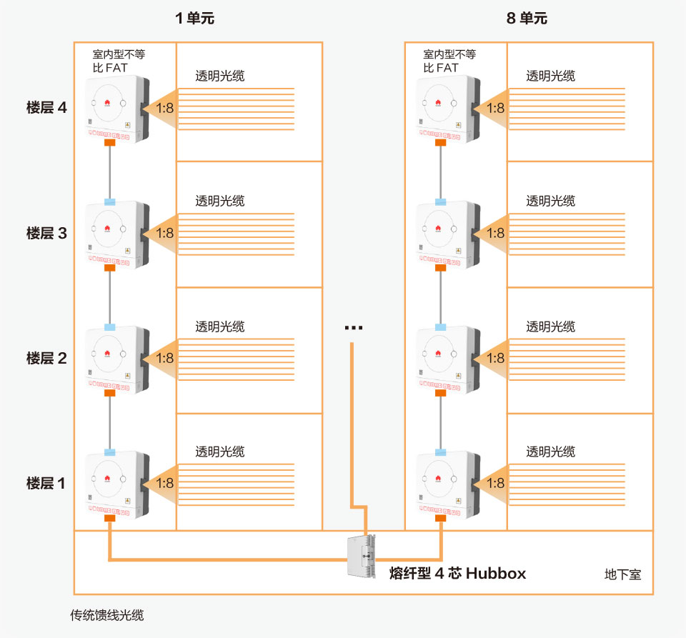 此方案(如圖11)是傳統(tǒng)饋線光纜進(jìn)樓,與HUBBOX相連,每個(gè)HUBBOX內(nèi)裝4個(gè)1:2分光器,出8條鏈路,每條鏈路級(jí)聯(lián)4個(gè)FAT,覆蓋一個(gè)單元32個(gè)用戶,比如每層樓有8個(gè)用戶,每個(gè)單元有4層,共計(jì)可覆蓋8個(gè)單元,256個(gè)用戶。